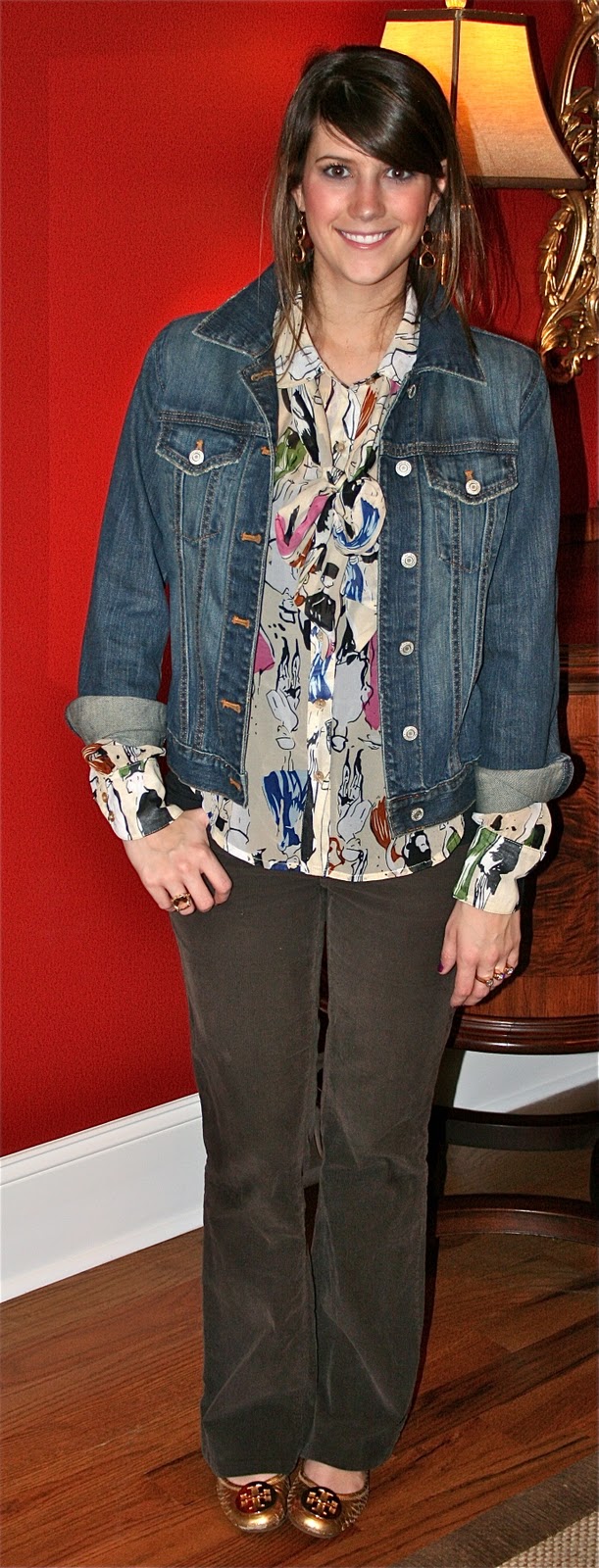 Top: Ark and Co, Jacket: Gap (old), Corduroys: Citizens of Humanity, Shoes: Tory Burch, Tank Top: Gap, Clutch: J.Crew, Watch: MK, Two-finger ring: F21, Earrings: Apparel Mart, Smoky Quartz ring: Belk's.